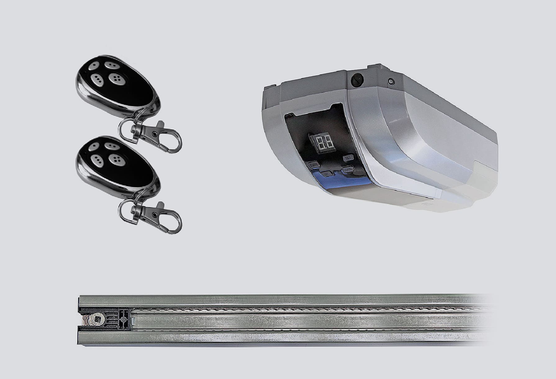 - Комплект состоит из электропривода, рейки и двух пультов д/у.