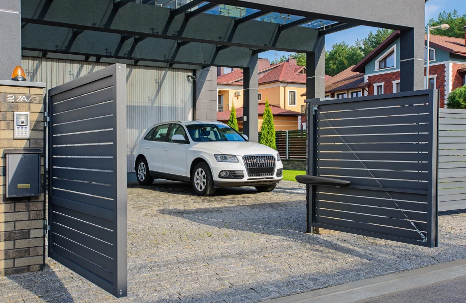 Современные надёжные въездные ворота из алюминия, которые при открытии сдвигаются параллельно забору. Благодаря этому обеспечиваются удобство эксплуатации конструкций и экономия территории предприятия.