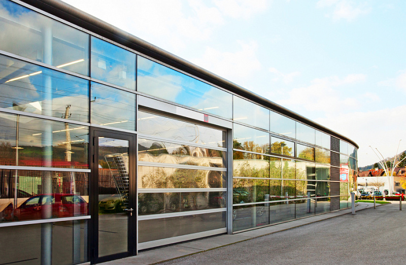 Стильное решение для имиджевых объектов. Ворота обеспечивают максимальную светопропускаемость и обладают высокой звуко- и теплоизоляцией.